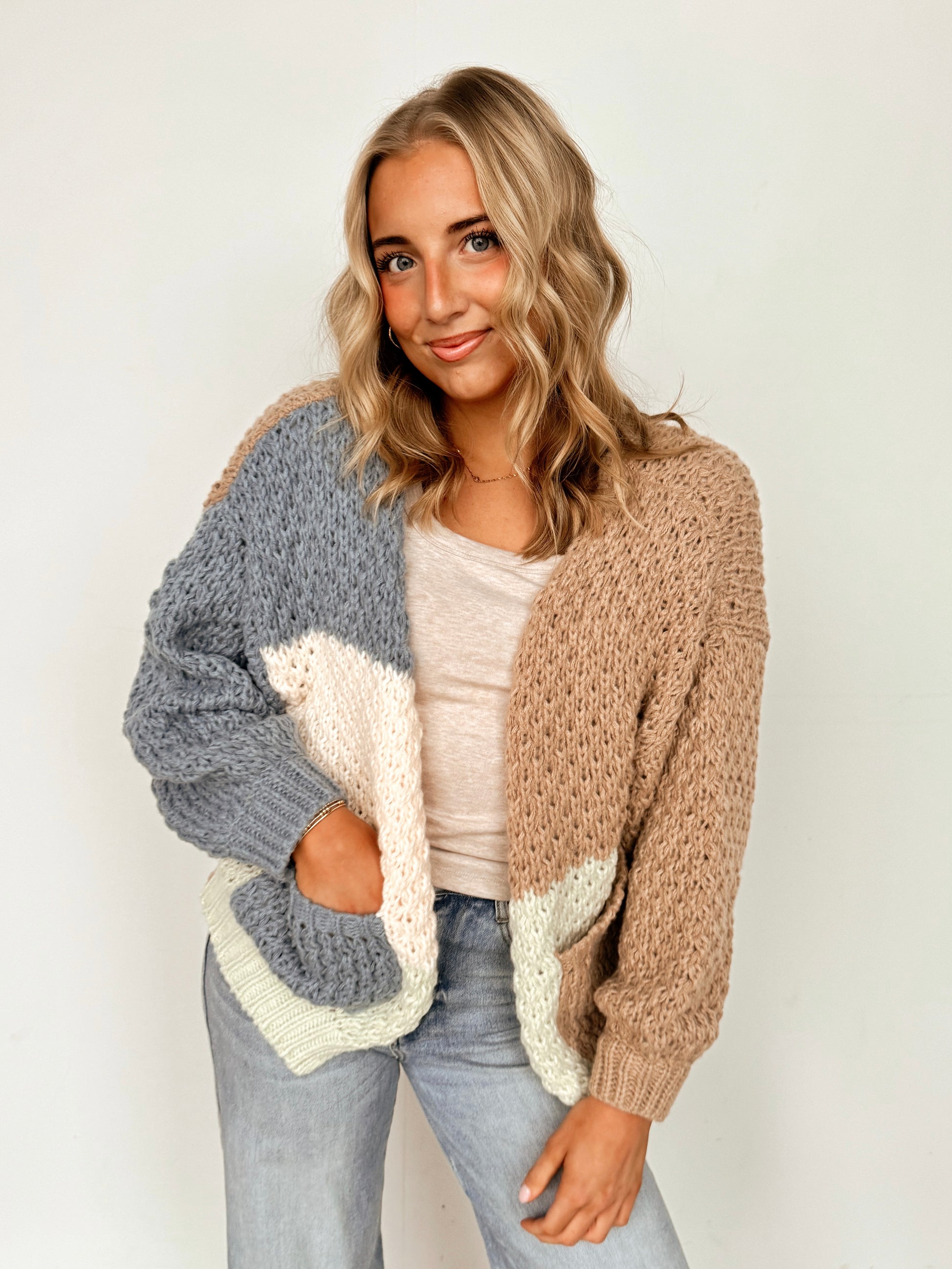 Elevate your winter wardrobe with the Blue & Beige Colorblock Cardigan! This chunky knit open cardigan offers a warm embrace on chilly days, combining style and comfort effortlessly. Its vibrant colorblock design not only enhances your look but also wraps you in coziness, making every outing a joy! Perfect for layering, this piece will inspire you to face the cold with confidence and flair!
