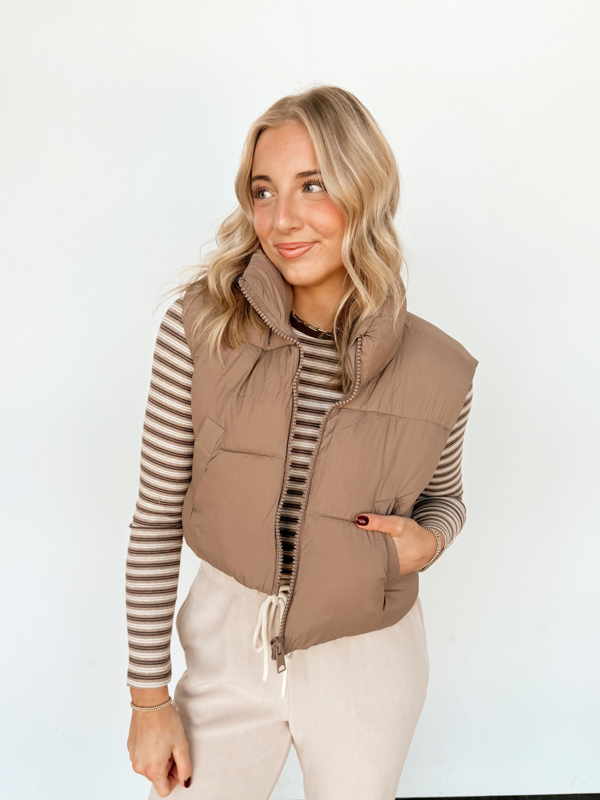 What’s not to love about this cocoa cropped puffer vest. Easy to layer over your favorite top this winter season. If between sizes, we recommend sizing up.