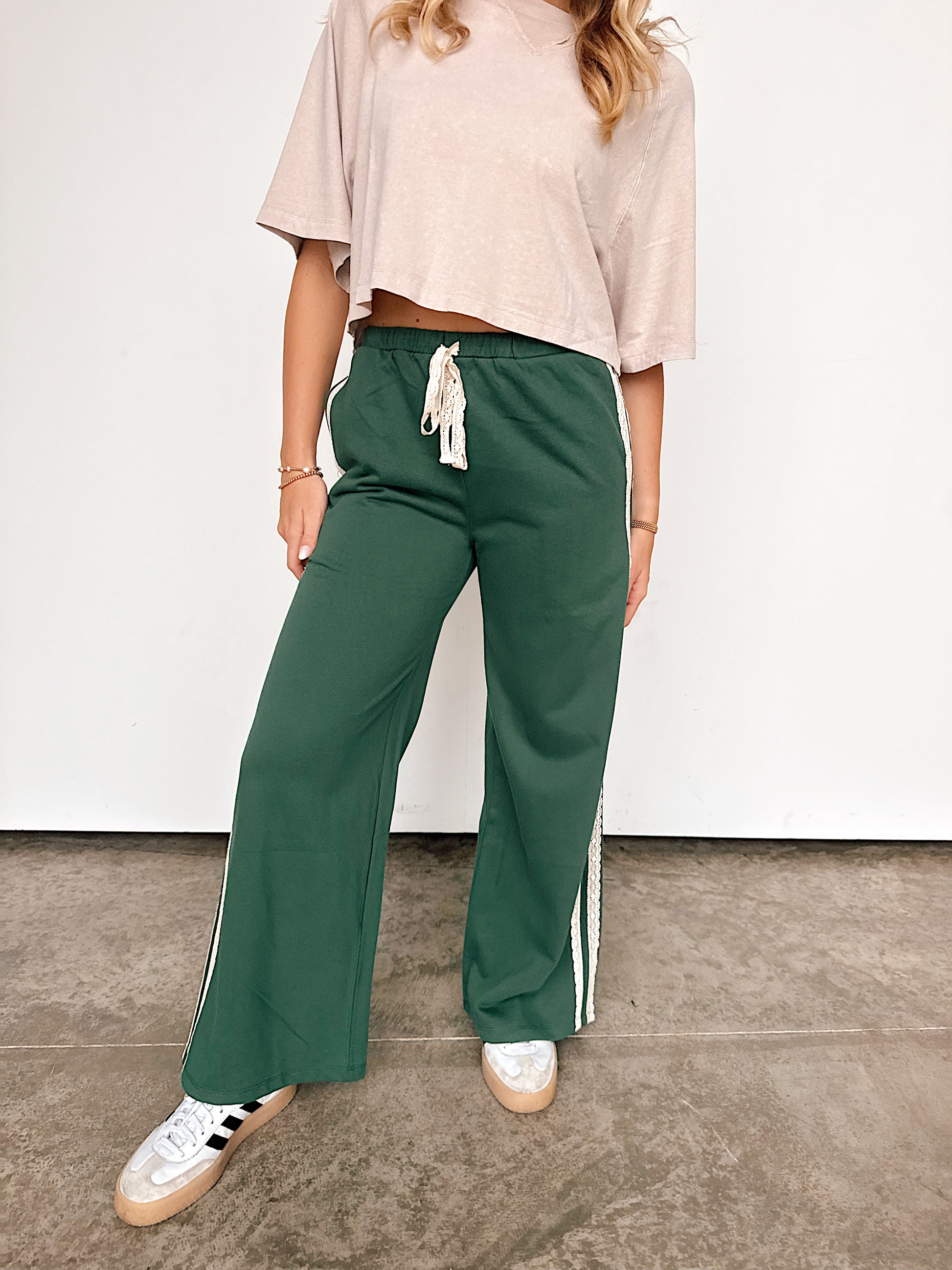 Experience comfort, style, and versatility with our Green Lace Side Track Pants. Made with soft cotton french terry knit fabric, these pants feature a delicate lace trim stripe on the sides and an elastic waist with a lace drawstring for a personalized fit. The wide leg design creates a relaxed, casual look perfect for any occasion.
