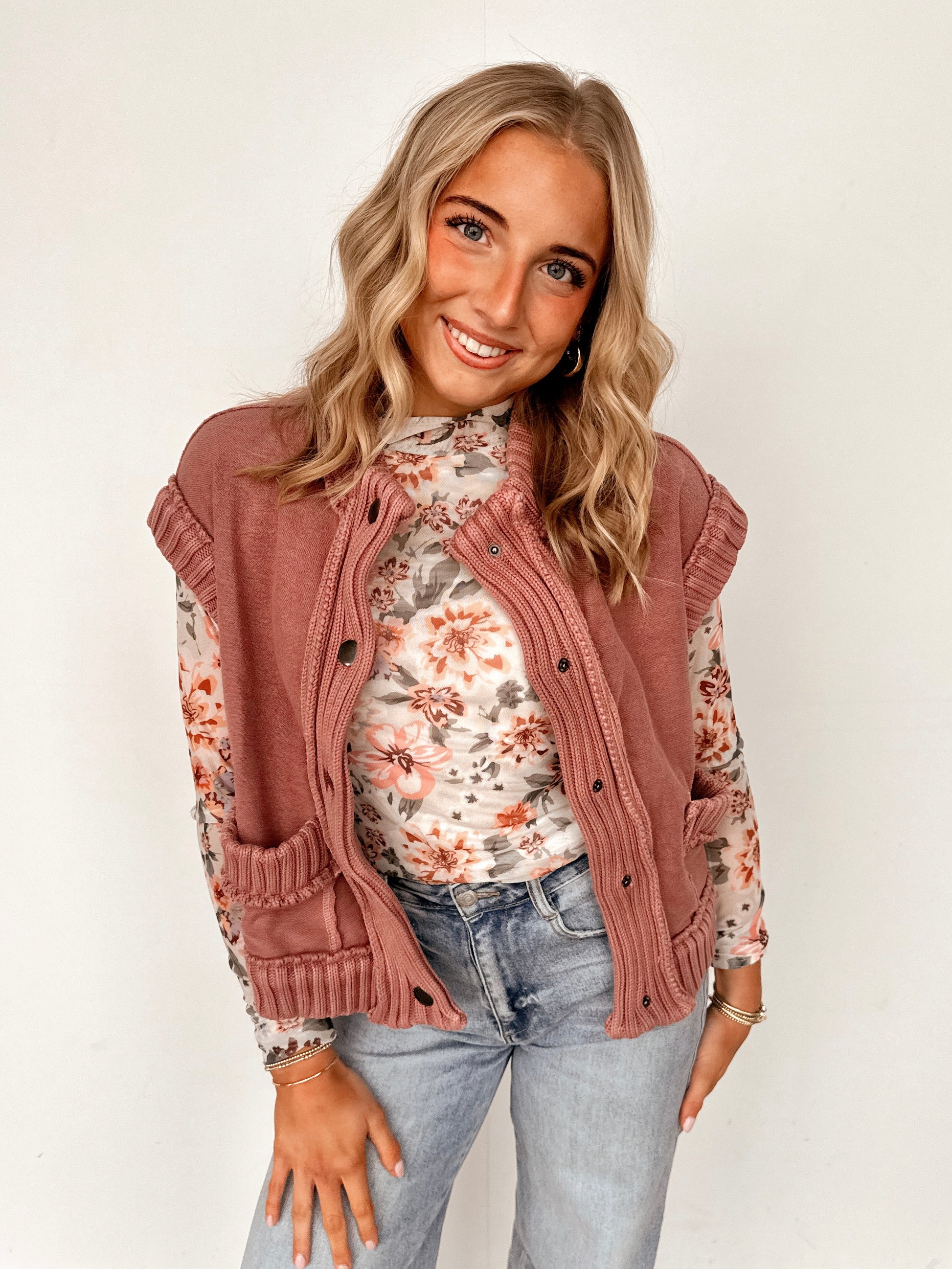 Introducing the Vintage Mauve Ribbed Vest! This beauty is pure perfection—like the cherry on top of your outfit. With its ribbed design and comfy fit, it's perfect for layering over our floral mesh top or either color of our scoop neck top.